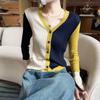 Autumn Elegant Buckle Wool Slim Sweater Women French Vintage Knitted Cardigan College Style Color Contrast V-neck Casual Tops
