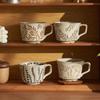 Retro keramický hrnek v americkém stylu s vysokou estetickou hodnotou, reliéf rostlin, středověký latte, káva, mléko, voda, odpolední čaj, nádobí na pití