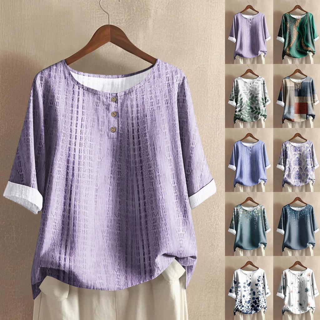 Women's Fashionable And Casual Shirt Half-sleeve Round Neck Print Cotton And Linen Blouse Top