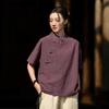 Johnature Women Chinese Style Shirts Solid Color Stand Tops Vintage Blend Summer Blouses Seven Sleeve Button Shirts