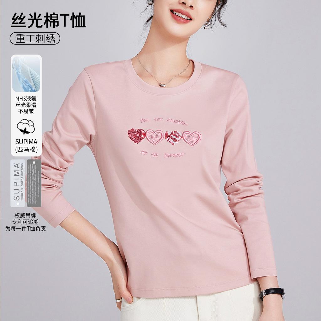 Mercerized cotton long-sleeved women's autumn new love embroidery casual loose and thin large-size top