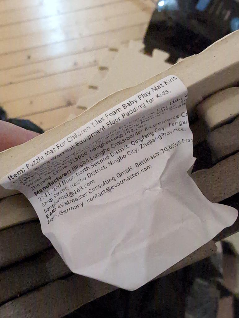 The mats come without proper packaging, without EU protection marks and very sparsely packaged. I'm not sure if I want to let my daughter play on them - it seems shockingly unprofessional... Some mats already show signs of wear or slight damage.