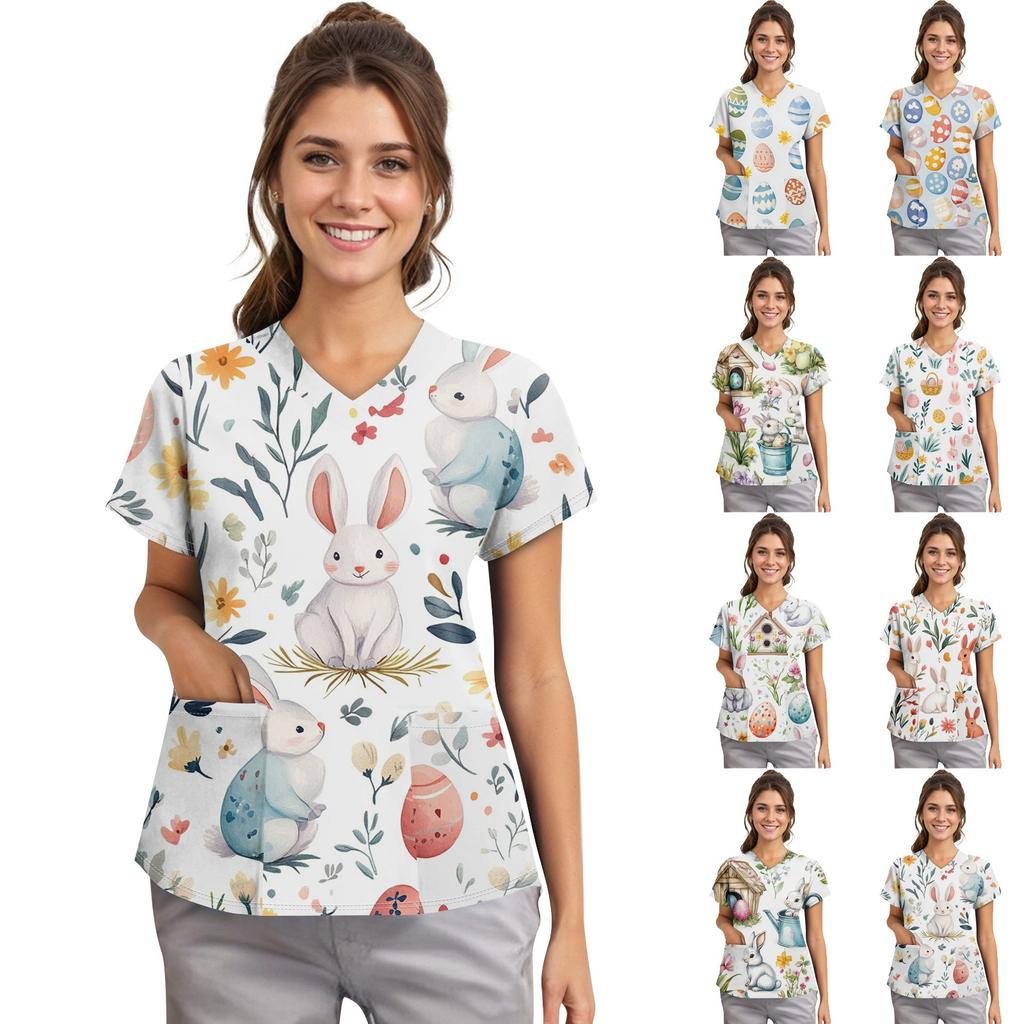 Women's Fashion V-neck Short Sleeve Workwear With Pockets Printed Tops