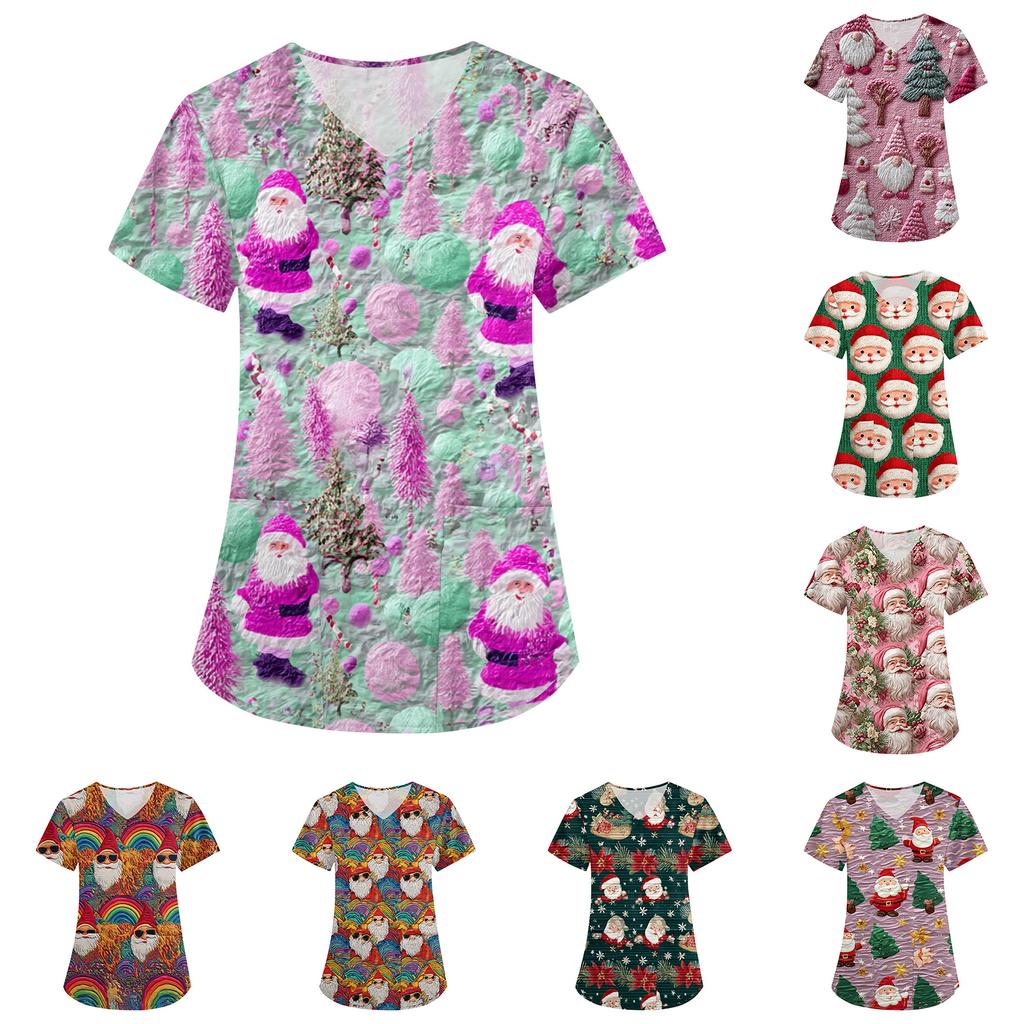 Women's Fashion V-Neck Short Sleeve Overalls With Pockets Christmas Printed Tops Clothes