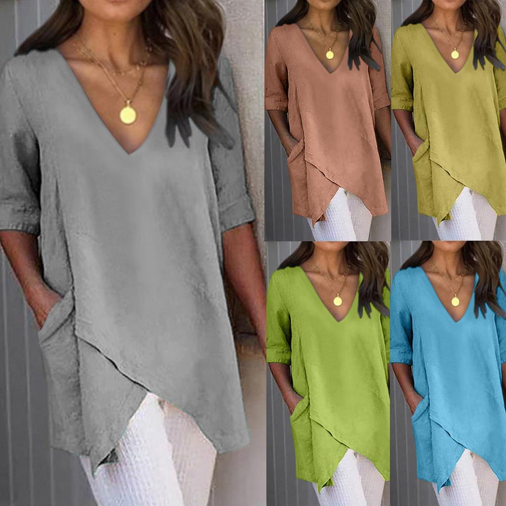 Women's Fashion Solid Colour Irregular Casual T-shirt V-Neck Half Sleeve Top