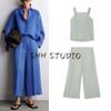 Vacation Style Back Slit Tops 3564123 Linen Blend Pleated Wide Leg Casual Trousers 3479848