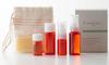This mini set is perfect for travel or as a trial. It includes a mild cleansing oil, a facial cleansing soap carefully aged using cold-process methods, a booster oil to promote lotion penetration*, a brightening lotion to promote radiant skin, and finally, a full barrier serum to lock in moisture.